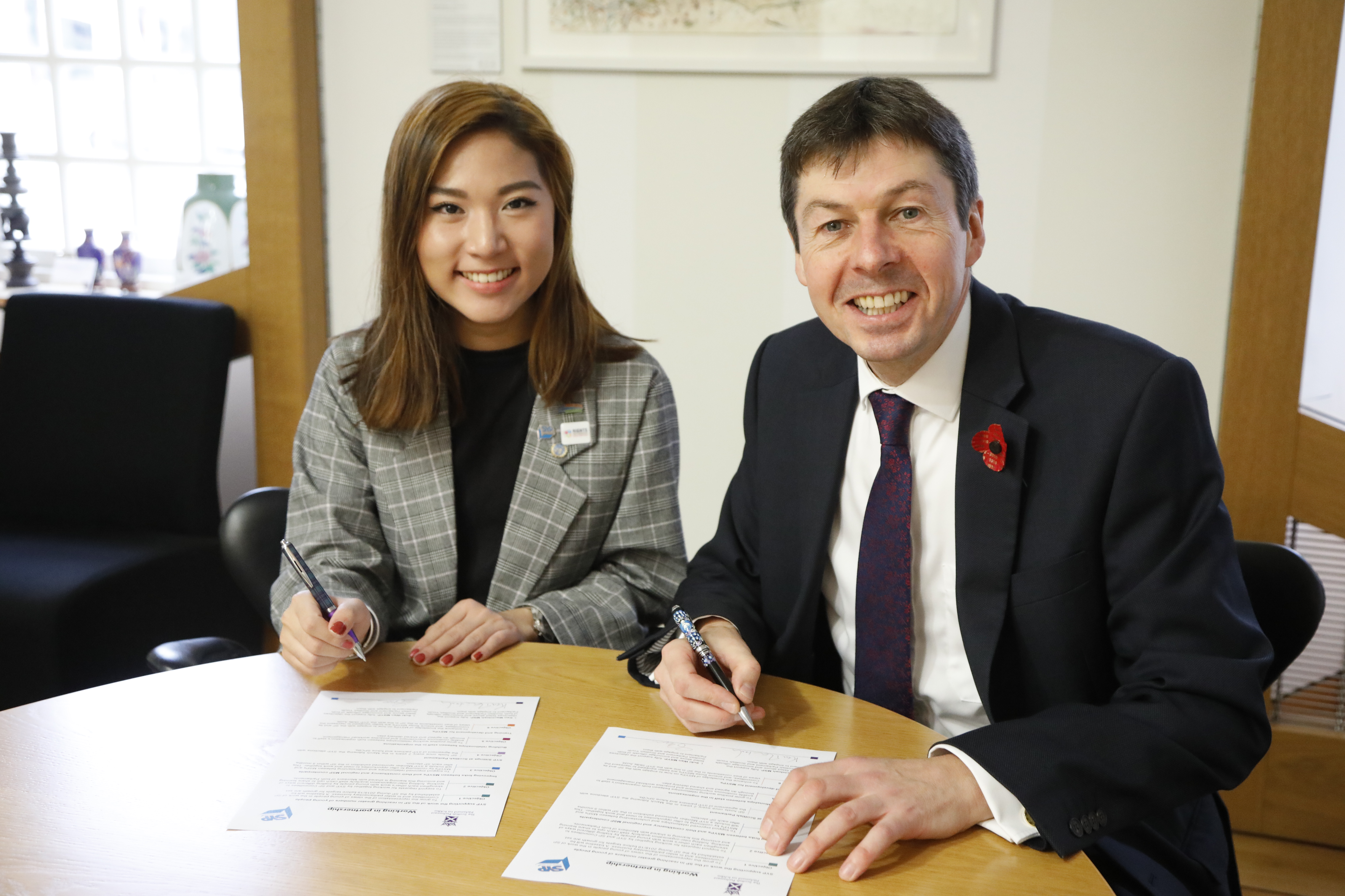 The Presiding Officer of the Scottish Parliament, the Rt Hon Ken Macintosh MSP, and the Chair of the Scottish Youth Parliament (SYP), Suki Wan MSYP, met to sign a document that signals their support for objectives (available here) that set out what that partnership working will look like for the two organisations.