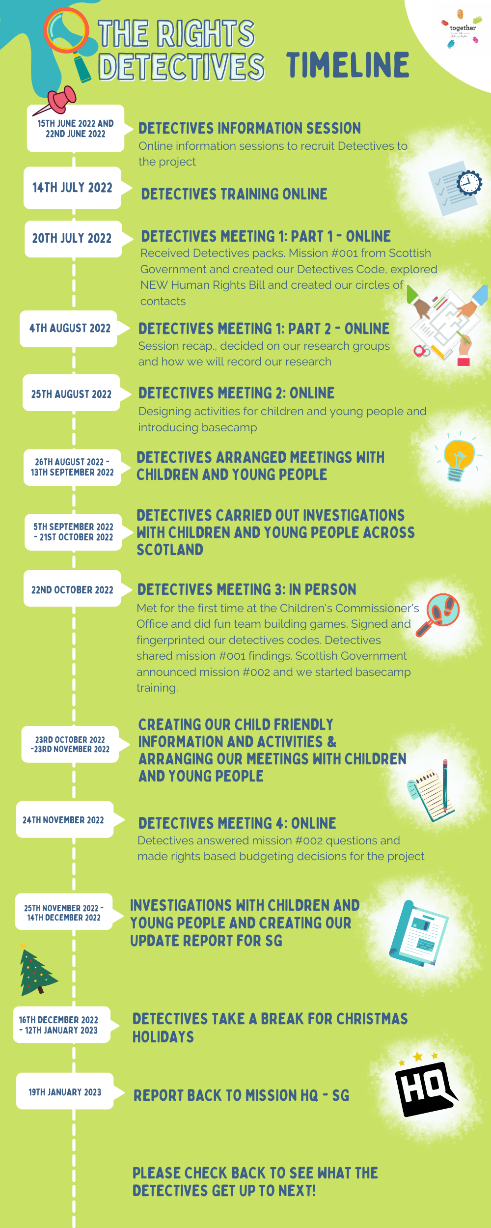Running from July 2022 to December 2023, the Rights Detectives receive special missions from Scottish Government and join Together for online and in-person sessions.  The missions involve investigative research with other children and young people to help make sure what matters to children is put into this new law!